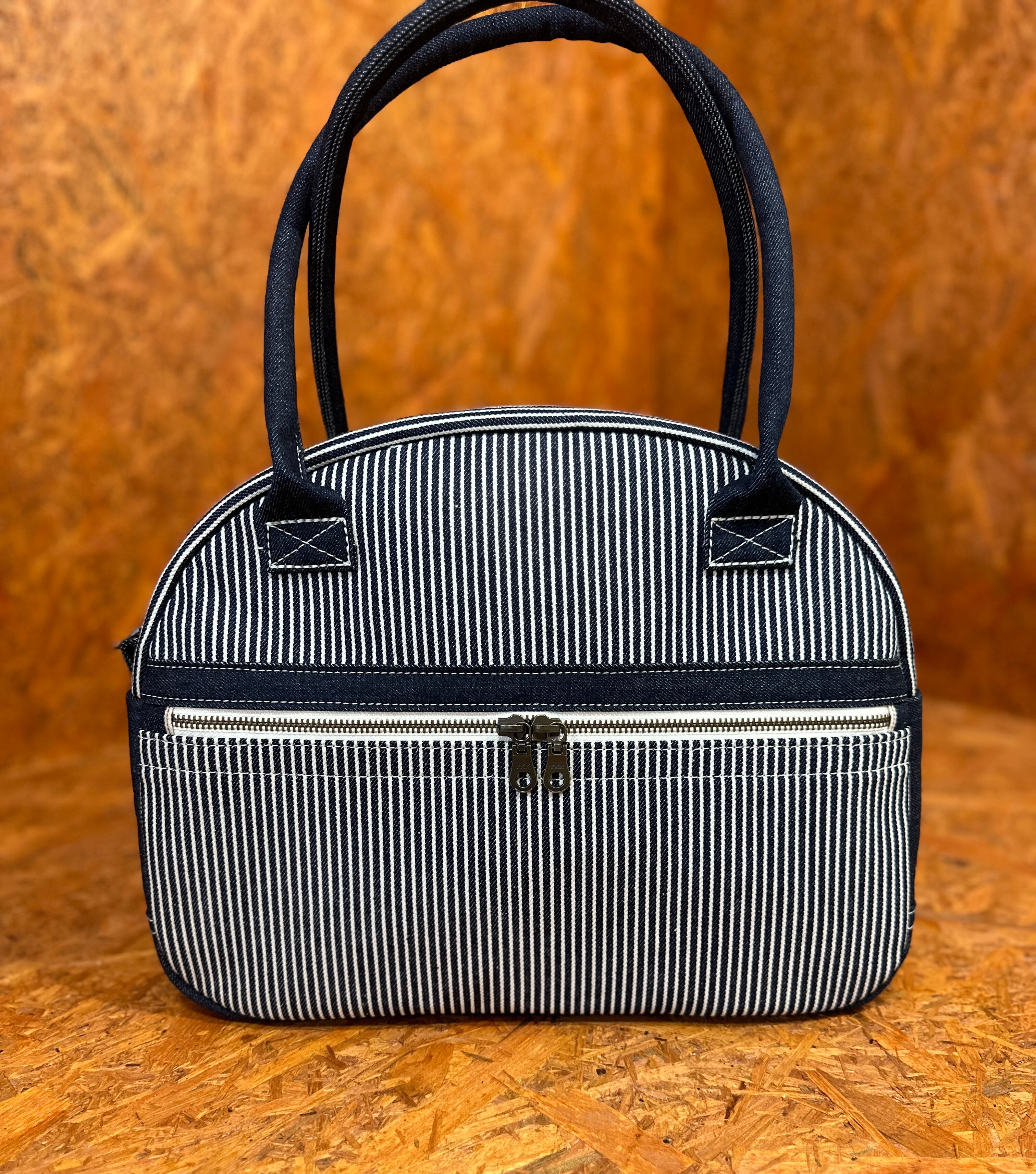 ——————————————————ヒッコリーデニムのストライプと丸型がアクセントのボストンバッグ!